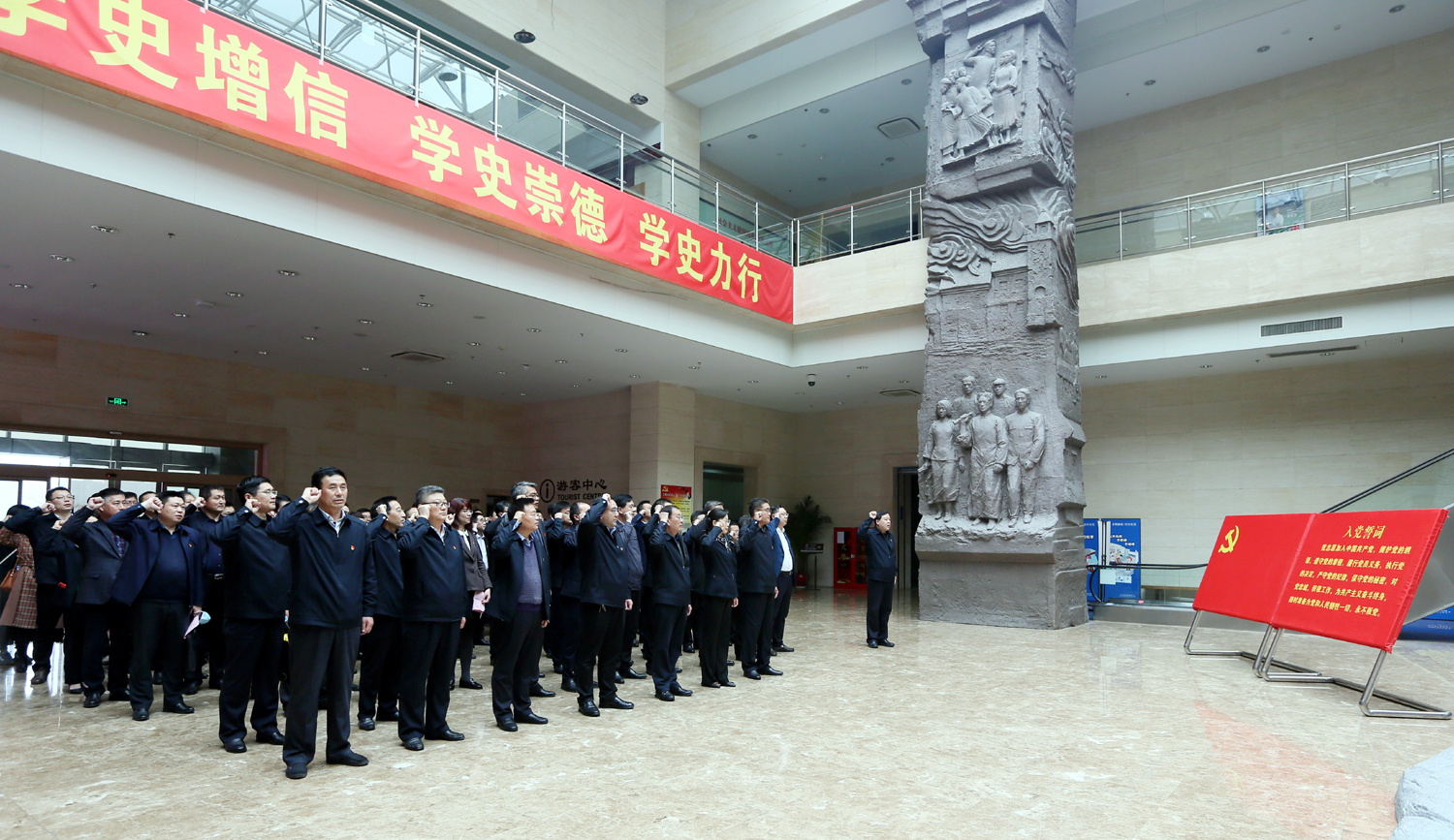 走進市革命紀念館,在鮮紅的黨旗下,全體黨員舉起右拳,重溫入黨誓詞,鏗鏘有力的誓詞,進一步激發黨員干部牢記黨的初心和使命。在紀念館展室,大家認真看、仔細聽,通過歷史文獻、革命文物、新聞圖片和視頻資料,真切感受到中國共產黨領導海屬地區人民在五四運動、土地革命、抗日戰爭、解放戰爭時期血與火的革命斗爭史。