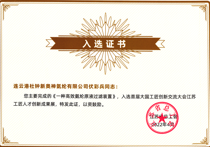 近日,全國總工會主辦首屆大國工匠創新交流大會,氨綸公司伏彩兵完成的《一種高效氨綸原液過濾裝置》創新成果入選大國工匠展伏彩兵入選首屆大國工匠創新交流大會江蘇展區重點展示科創推薦通道。本次大會以技能強國,創新有我”為主題,通過線上線下形式展示以大國工匠為代表的廣大職工的精湛技能和創新成果,為廣大高技能人才搭建交流平臺。