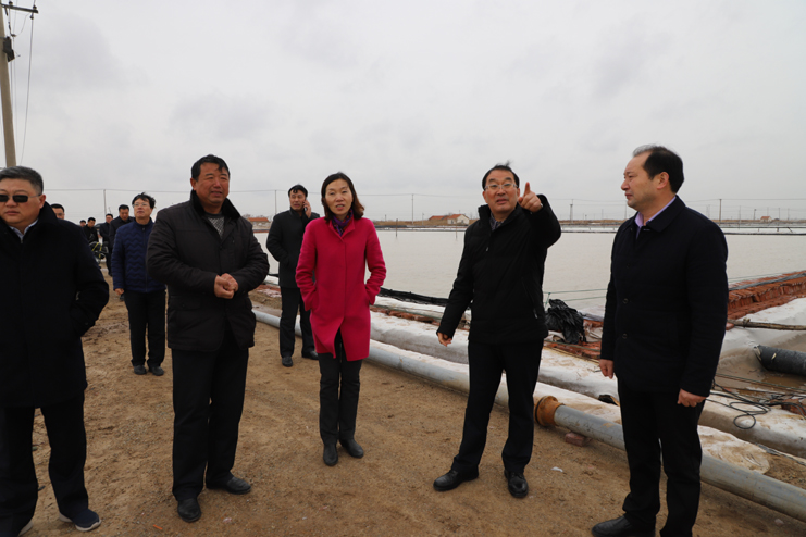 胡建明總經理一行分別到原鈣液復曬區養殖池塘改造施工現場和新河制鹽分公司五班的扒鹽現場進行實地調研,詳細了解工程的施工情況和日曬制鹽公司的生產情況。在原鈣液復曬區,只見彩旗招展,幾臺挖掘機正在緊張施工之中,對灘地進行養殖池塘改造,工程施工人員搶時間,抓進度,爭取在養殖旺季來臨之時,完成工程施工投入養殖生產。日曬制鹽公司目前已經出動五臺扒鹽機組投入到春季扒鹽工作中來,預計上半年將完成25萬噸的扒鹽任務。隨后在機關三樓會議室召開流動辦公會,投資公司董事長李國文對灌西投資公司和日曬制鹽公司的生產經營情況進行了匯報。他表示,2018年,灌西投資公司將積極迎接挑戰,以“三超兩增一確保”為工作目標,產鹽58萬噸,實現綜合利潤翻一番工作任務而努力奮斗。同時也提出,公司當前面臨原料礦鹵要漲價、原鹽一線員工年齡老化、職工小區房產證協調辦理等諸多發展難題,希望集團公司領導給予高度重視。集團公司領導相繼發言,現場辦公,針對各類問題分別進行了研討,提出建議,解決問題。