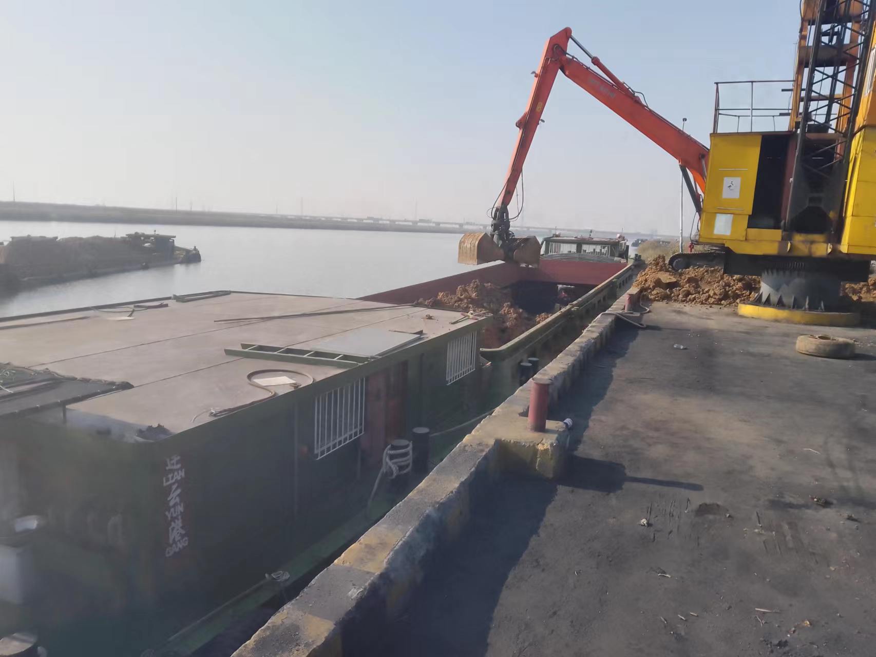 近日,宵洋物流公司碼頭十幾輛運輸車輛有序排列著,工人正在不停的操作機械、裝卸綠化土等工作,報崗船只頻繁進出,安全員在現場安全管理,整個過程井然有序,生產現場一派繁忙景象。