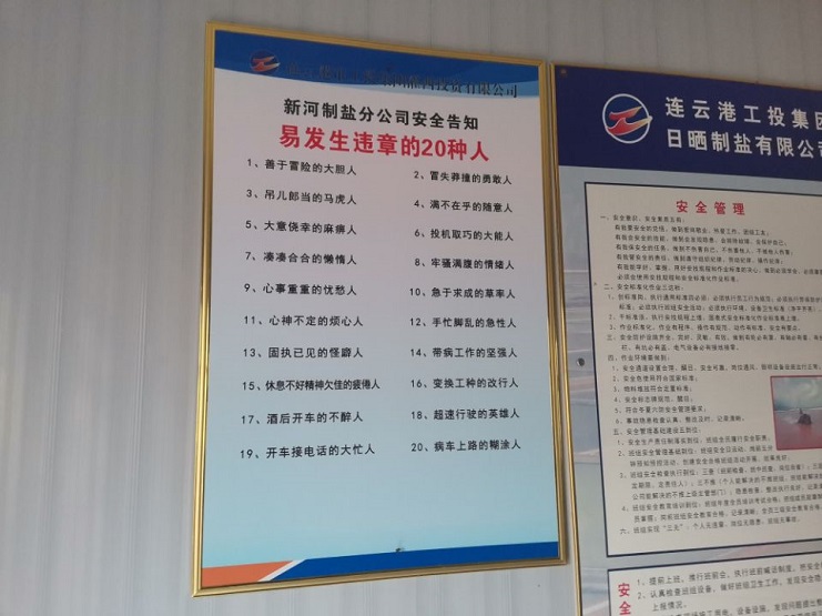 4月25日,新河制鹽分公司對16個產鹽班組安全活動室加裝安全告知牌,這是該公司防范人為因素造成安全事故,確保安全生產形勢穩(wěn)定采取的措施之一。