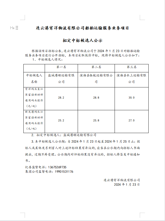 連云港宵洋物流有限公司船舶運輸服務業務項目擬定中標候選人公示