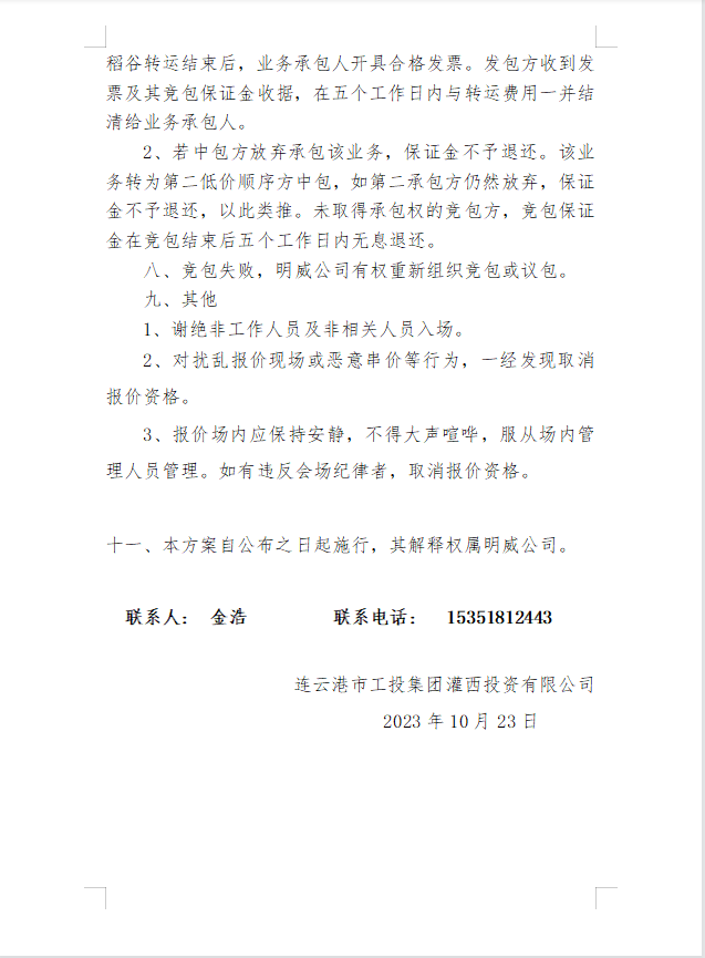 2023年秋收稻谷轉運業務發包公告