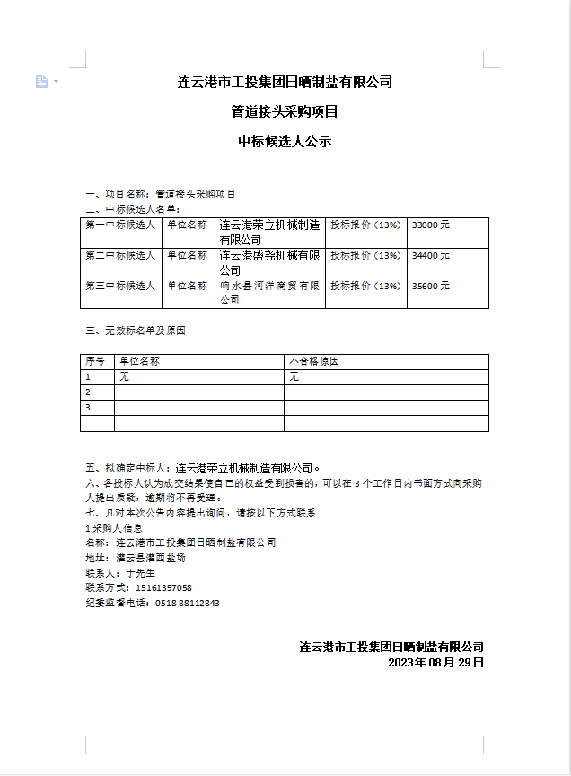 連云港市工投集團(tuán)日曬制鹽有限公司 管道接頭采購項(xiàng)目中標(biāo)候選人公示