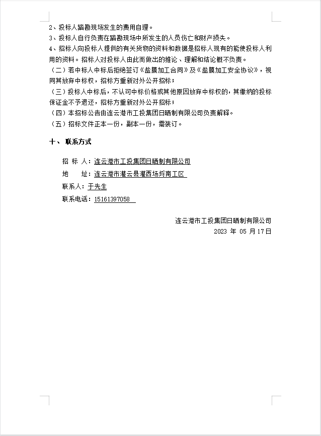 連云港市工投集團日曬制鹽有限公司鹽膜壓合加工招標公告