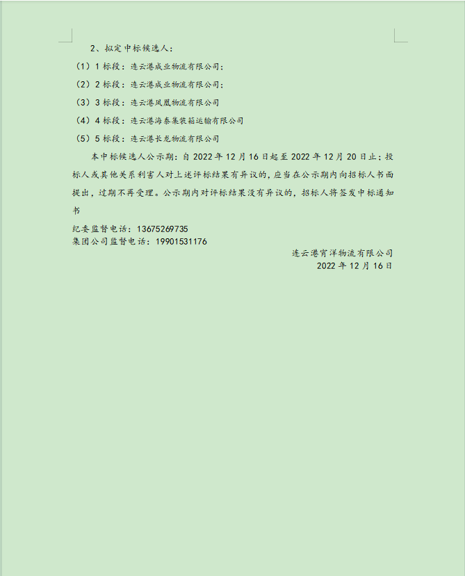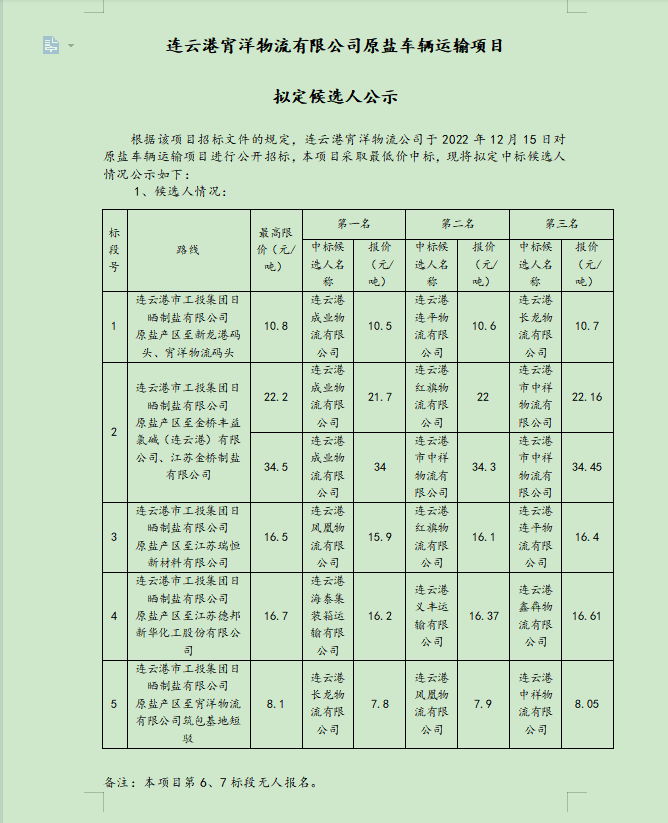 連云港宵洋物流有限公司原鹽車輛運輸項目擬定候選人公示
