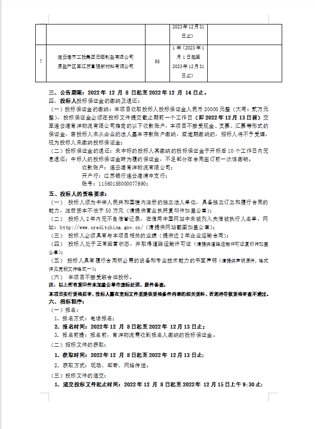 連云港宵洋物流有限公司原鹽車輛運輸項目招標公告