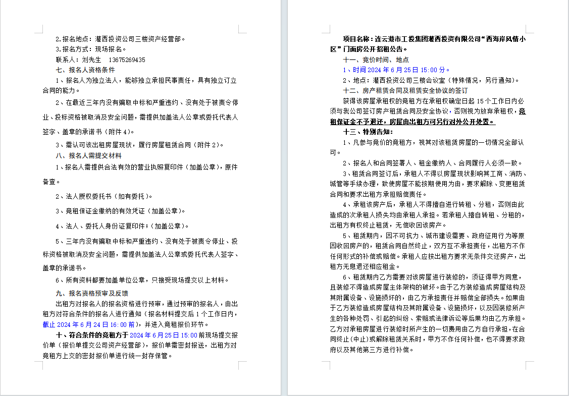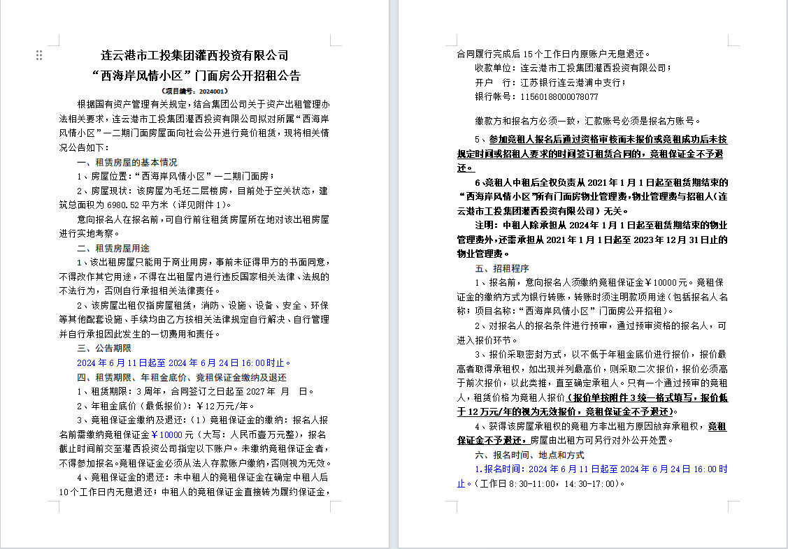 連云港市工投集團灌西投資有限公司“西海岸風情小區”門面房公開招租公告