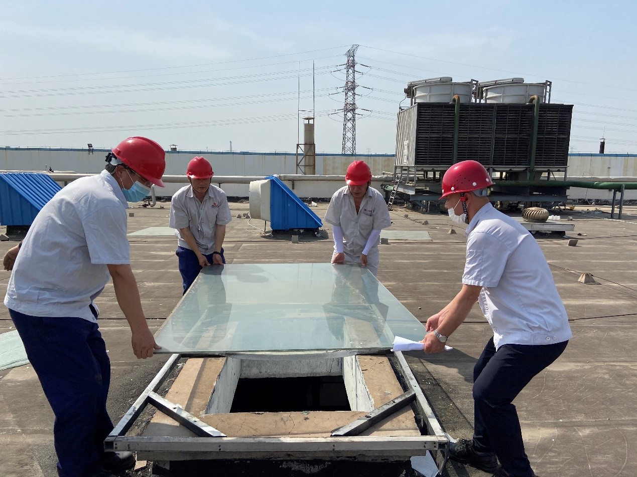 檢查過程中,總經理韓立新發現部分天窗玻璃蓋板有破損,當機立斷,頂著炎炎烈日,率先搬起備用玻璃蓋板,動員安委會成員一起更換天窗玻璃蓋板,及時消除安全隱患,筑牢安全防線。艷陽下燙手的玻璃,燙著韓總等安委會成員的手,但溫暖著一線員工的心,切實感受到公司對員工生命安全重視。