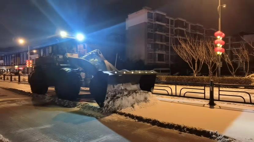 當晚,按照“即下即清、先通后凈、保障通行”的清雪除冰原則,在統一調度下,一臺臺清雪設備有序穿行于道路上,撒布機打頭陣,推雪板車緊隨其后,將路面積雪進行打通,地上的雪從前向后逐次被清雪車輛推向道路邊緣。隨后,由人工加以配合,在人機結合方式下,冰雪被裝到車上清運走。