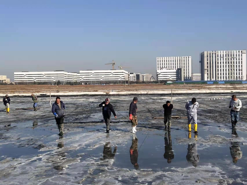 礦鹽復產項目部,聘請日曬制鹽專家王緒前進行工藝指導,聘請勞模朱春年帶領團隊攻堅。復產戰役從2021年12月就打響了,春節的時候,他們僅休了三天假,大年初三全部到崗,一鍬一鍬挖泥通溝,一條一條池堰加高整平,一塊一塊鹽田清理壓實......到2月,他們硬是把征地后廢棄許久的鹽田和邊角地整理成礦鹽基地,結晶池面積達1950公畝,達產可產原鹽20000噸。