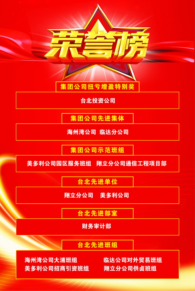 臺北投資公司連續兩年被集團公司授予“扭虧增盈特別獎”;海州灣公司、臨達分公司被評為先進集體;美多利公司園區服務班組、翔立分公司通信工程項目部被評為示范班組;夏軍、趙原塵、袁桂誠、宋文靜被評為優秀員工。