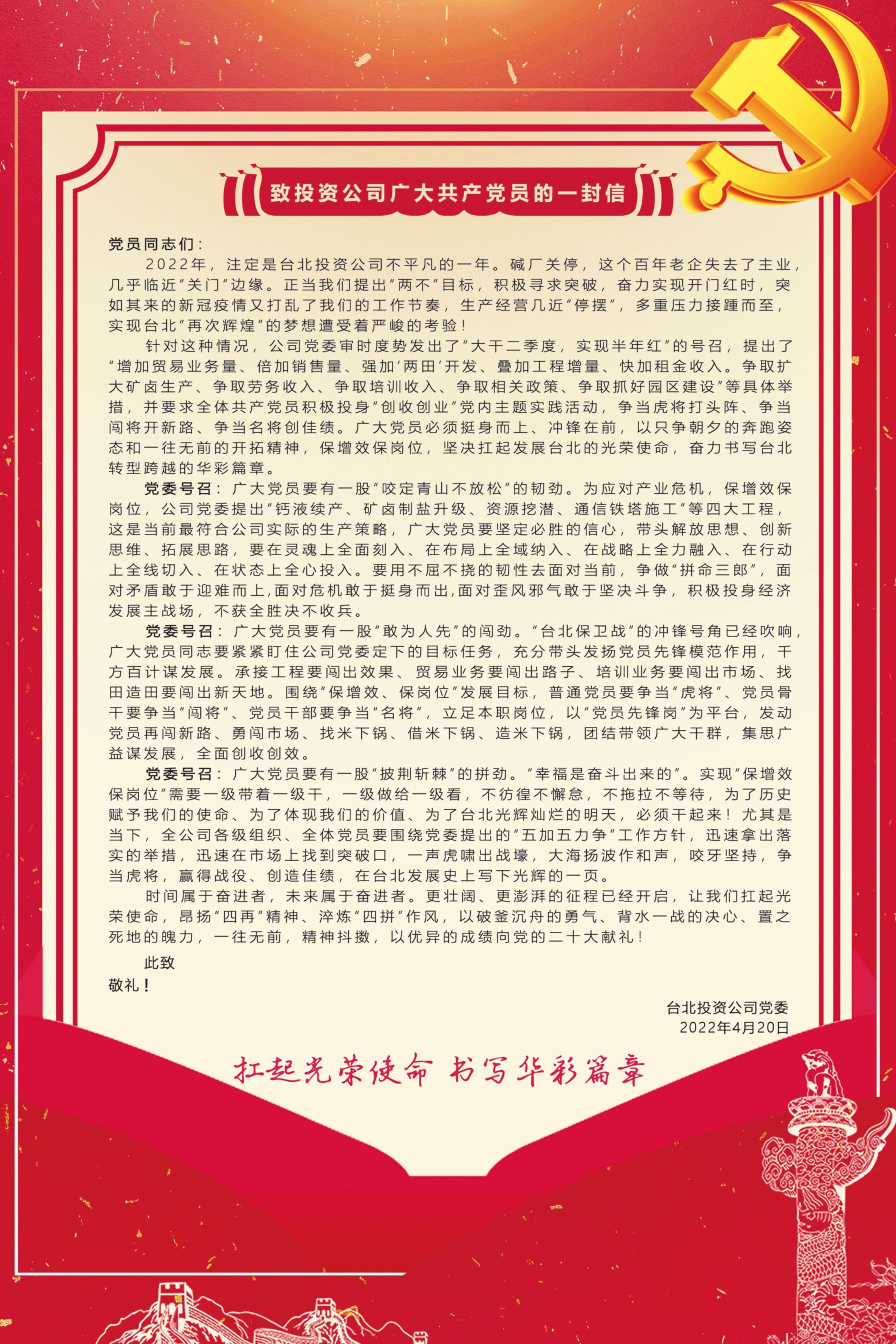 扛起光榮使命 書(shū)寫(xiě)華彩篇章——致投資公司廣大共產(chǎn)黨員的一封信