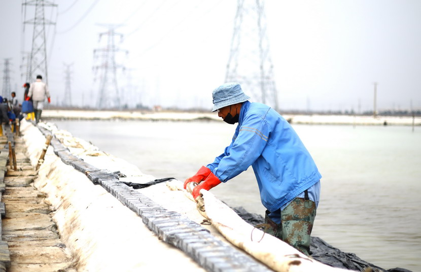 ? ? ? ??首先來到海州灣公司大浦班組。這里是公司礦鹵復產工作重點班組,職工們正在整理結晶池、搶修塑苫布。據海州灣公司負責人劉天義現場介紹,由于前期審批、采購等原因,加之突發的新冠肺炎疫情,結晶池塑苫布沒能及時更新,預報25日有明顯降雨過程,海州灣廣大職工因地制宜,收舊利廢,積極備戰大雨天時。
